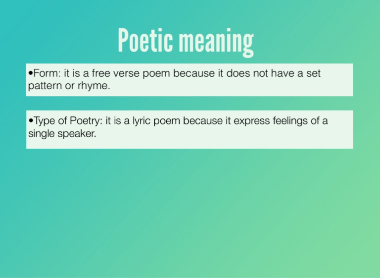•Form: it is a free verse poem because it does not have a set pattern or rhyme.