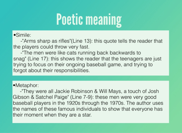 -"They were all Jackie Robinson & Will Mays, a touch of Josh Gibson & Satchel Paige" (Line 7-9): these men were very good baseball players in the 1920s through the 1970s. The author uses the names of these famous individuals to show that everyone has their moment when they are a star.