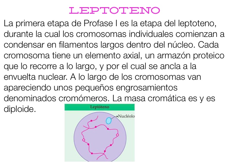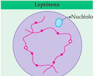 La primera etapa de Profase I es la etapa del leptoteno, durante la cual los cromosomas individuales comienzan a condensar en filamentos largos dentro del núcleo. Cada cromosoma tiene un elemento axial, un armazón proteico que lo recorre a lo largo, y por el cual se ancla a la envuelta nuclear. A lo largo de los cromosomas van apareciendo unos pequeños engrosamientos denominados cromómeros. La masa cromática es y es diploide.