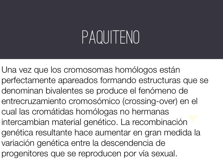 Una vez que los cromosomas homólogos están perfectamente apareados formando estructuras que se denominan bivalentes se produce el fenómeno de entrecruzamiento cromosómico (crossing-over) en el cual las cromátidas homólogas no hermanas intercambian material genético. La recombinación genética resultante hace aumentar en gran medida la variación genética entre la descendencia de progenitores que se reproducen por vía sexual.