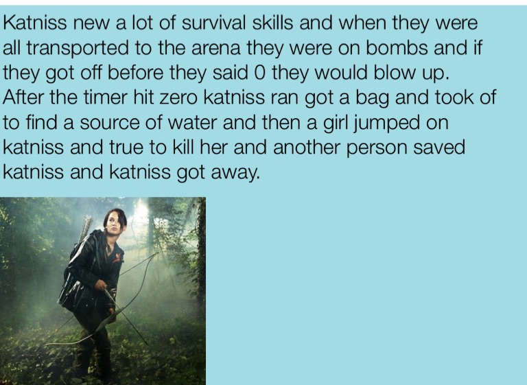 Katniss new a lot of survival skills and when they were all transported to the arena they were on bombs and if they got off before they said 0 they would blow up. After the timer hit zero katniss ran got a bag and took of to find a source of water and then a girl jumped on katniss and true to kill her and another person saved katniss and katniss got away.