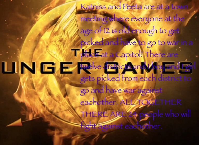 Katniss and Peeta are at a town meeting where everyone at the age of 12 is old enough to get picked and have to go to war in a place at a Capitol! There are twelve districts and 1 boy and 1 girl gets picked from each district to go and have war against eachother. ALL TOGETHER THERE ARE 24 people who will fight against eachother.
