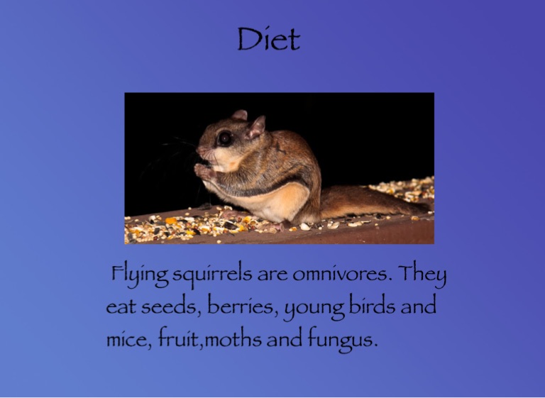 Flying squirrels are omnivores. They eat seeds, berries, young birds and mice, fruit,moths and fungus.