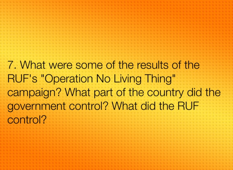 7. What were some of the results of the RUF's "Operation No Living Thing" campaign? What part of the country did the government control? What did the RUF control?