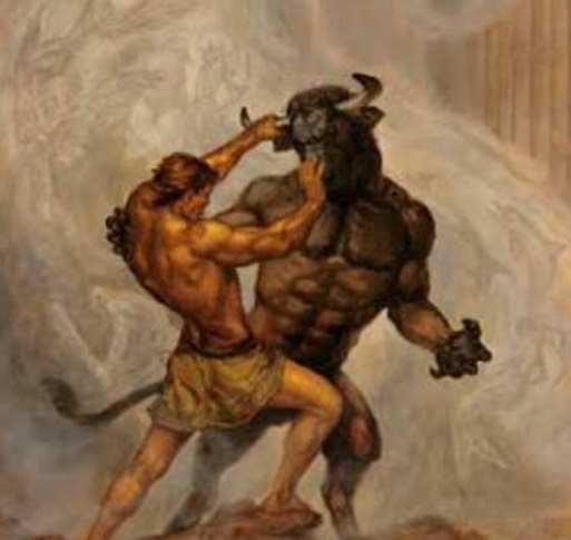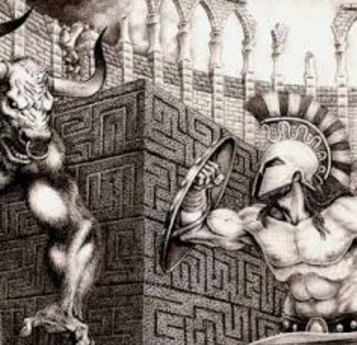 When Theseus entered the labyrinth, he quickly encountered the Minotaur. Theseus grabbed the monster by its horns and tore them off. He then threw one of them like a javelin, puncturing the beasts chest. He then escaped using Adrianes string.