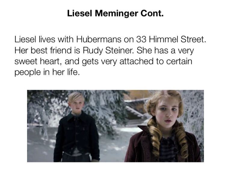Liesel lives with Hubermans on 33 Himmel Street. Her best friend is Rudy Steiner. She has a very sweet heart, and gets very attached to certain people in her life.
