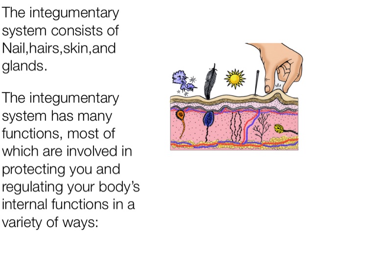 The integumentary system consists of Nail,hairs,skin,and glands.