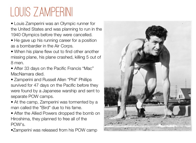 • Louis Zamperini was an Olympic runner for the United States and was planning to run in the 1940 Olympics before they were cancelled.