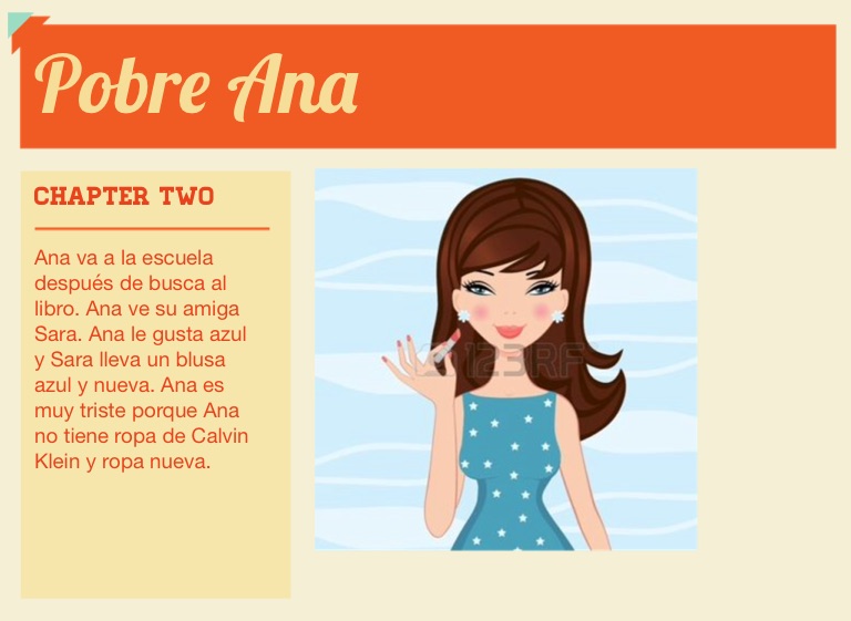 Ana va a la escuela después de busca al libro. Ana ve su amiga Sara. Ana le gusta azul y Sara lleva un blusa azul y nueva. Ana es muy triste porque Ana no tiene ropa de Calvin Klein y ropa nueva.