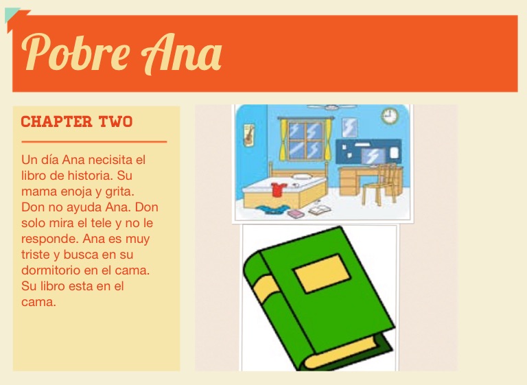 Un día Ana necisita el libro de historia. Su mama enoja y grita. Don no ayuda Ana. Don solo mira el tele y no le responde. Ana es muy triste y busca en su dormitorio en el cama. Su libro esta en el cama.