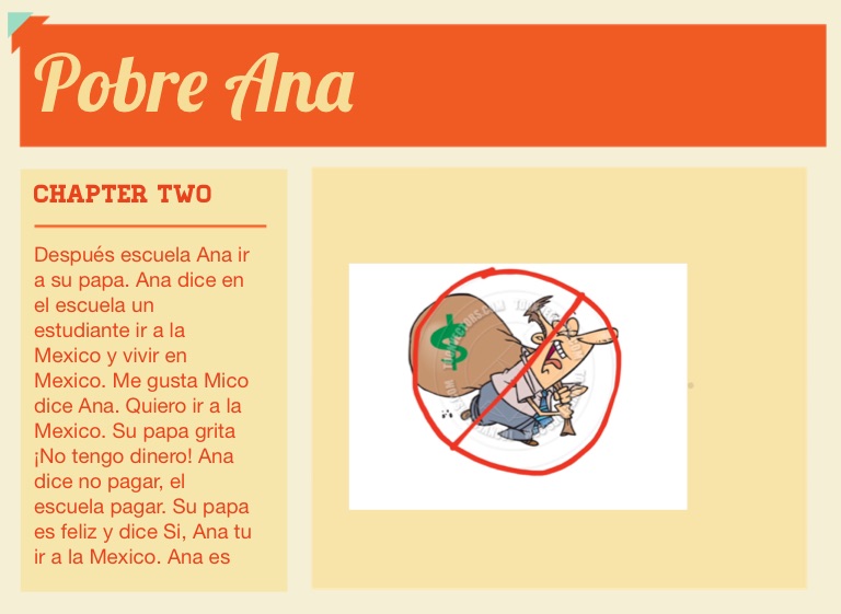 Después escuela Ana ir a su papa. Ana dice en el escuela un estudiante ir a la Mexico y vivir en Mexico. Me gusta Mico dice Ana. Quiero ir a la Mexico. Su papa grita ¡No tengo dinero! Ana dice no pagar, el escuela pagar. Su papa es feliz y dice Si, Ana tu ir a la Mexico. Ana es muy feliz también.