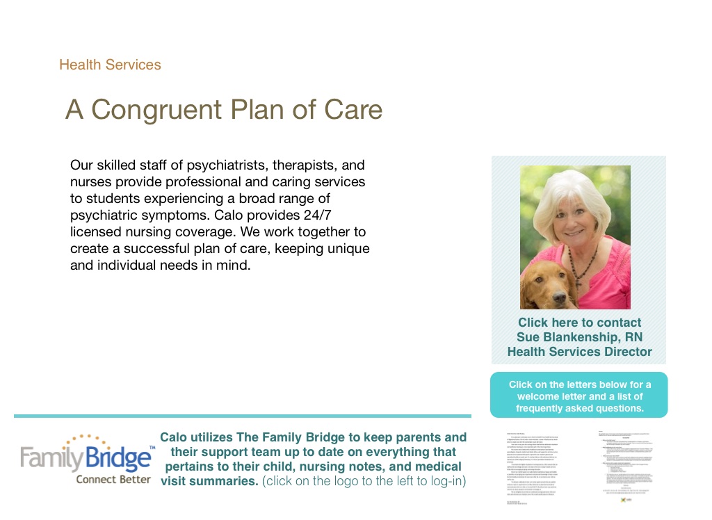 Our skilled staff of psychiatrists, therapists, and nurses provide professional and caring services to students experiencing a broad range of psychiatric symptoms. Calo provides 24/7 licensed nursing coverage. We work together to create a successful plan of care, keeping unique and individual needs in mind.