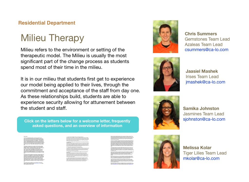 Milieu refers to the environment or setting of the therapeutic model. The Milieu is usually the most significant part of the change process as students spend most of their time in the milieu.