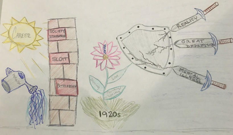 Zelda is the beautiful flower who lays on a foundation of the 1920s: something that defines her especially. In this cartoon she puts up a facade (shield) in order to deter reality and other terrible things from getting to her and stabbing her. However her shield is cracking and that depicts the fact that she cannot fully escape reality of life. On the other side, bricks such as Scott, patriarchy, and societal standards are pressing her from getting nourishment such as a career and motivation in order to grow her leaves(hobbies): writing painting, love, and dancing. Without the nourishment she cannot develop her purpose and beauty in life and is left to battle with her illness, the Great Depression, and reality.
