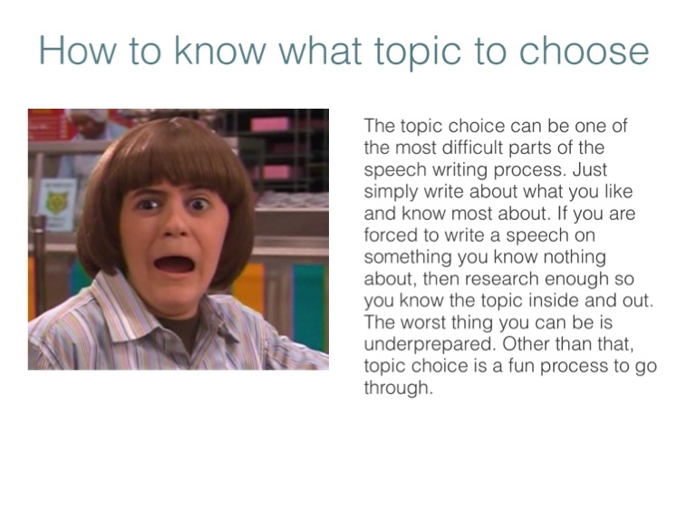 The topic choice can be one of the most difficult parts of the speech writing process. Just simply write about what you like and know most about. If you are forced to write a speech on something you know nothing about, then research enough so you know the topic inside and out. The worst thing you can be is underprepared. Other than that, topic choice is a fun process to go through.