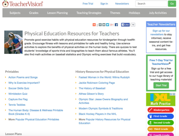 Teacher Vision is a great resource for K-12 teachers to use because it offers a variety of physical education and health printables and modified lessons for physical activity lessons to help with ESOL or Adaptive physical education. This website offers cross-content material to help make connections for students who have strengths in other contents by connecting it to physical education. There are Language Arts activities for Physical Education, Physical Education and Science connected, Health and Safety activities for physical education, Sports resources, Olympic game connections, and Social Studies and Physical Education.