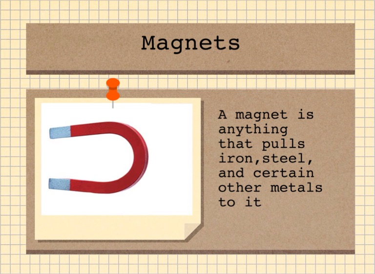 A magnet is anything that pulls iron,steel, and certain other metals to it