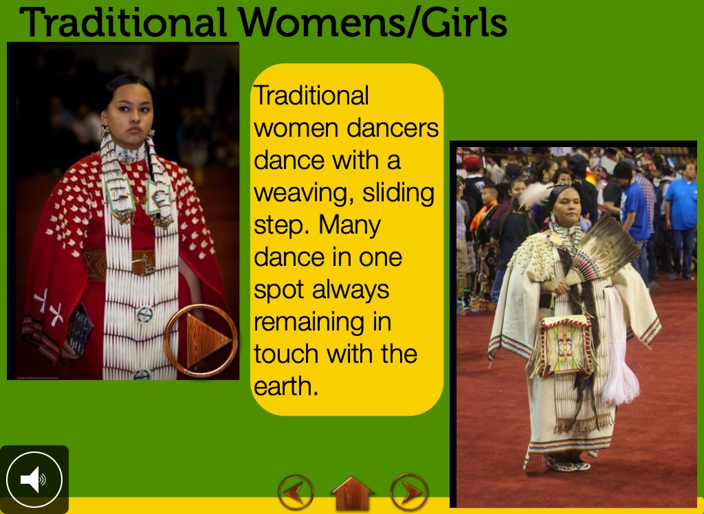 Traditional women dancers dance with a weaving, sliding step. Many dance in one spot always