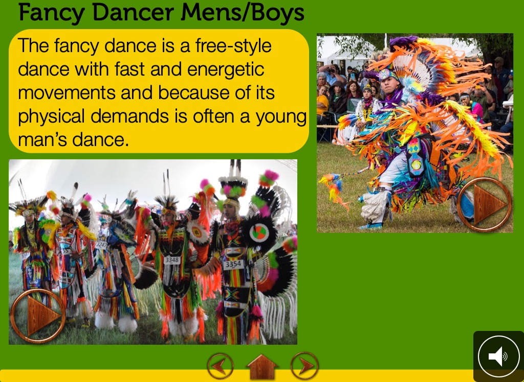 The fancy dance is a free-style dance with fast and energetic movements and because of its physical demands is often a young man’s dance.