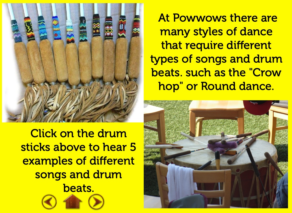 At Powwows there are many styles of dance that require different types of songs and drum beats. such as the "Crow hop" or Round dance.