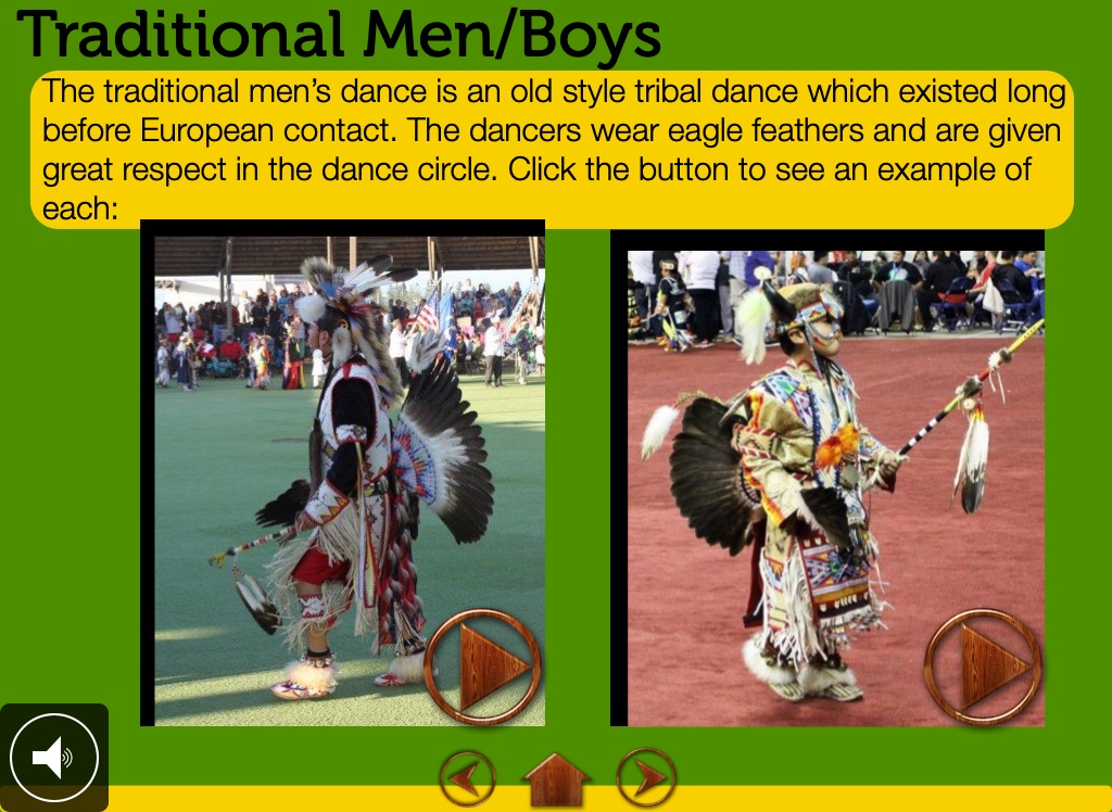 The traditional men’s dance is an old style tribal dance which existed long before European contact. The dancers wear eagle feathers and are given great respect in the dance circle. Click the button to see an example of each:
