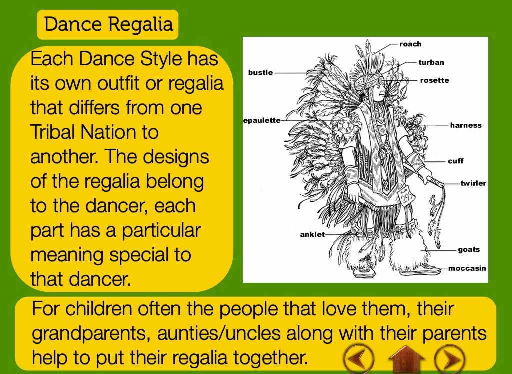 Each Dance Style has its own outfit or regalia that differs from one Tribal Nation to another. The designs of the regalia belong to the dancer, each part has a particular meaning special to that dancer. For children often the pe