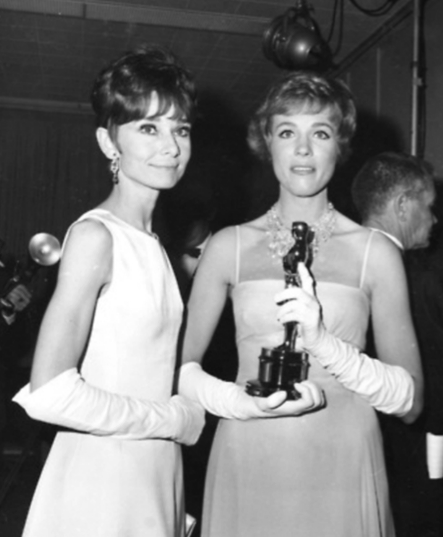 Audrey Hepburn (left) with Julie Andrews holding her award for Best Actress as Mary Poppins at the 1965 oscars.