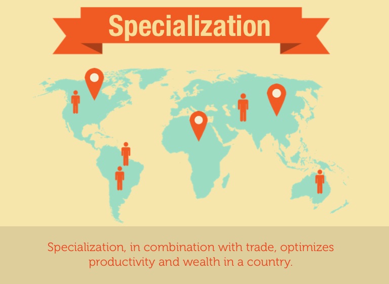 Specialization, in combination with trade, optimizes productivity and wealth in a country.