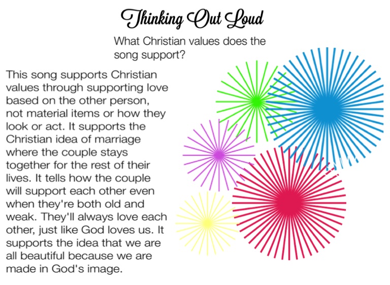 This song supports Christian values through supporting love based on the other person, not material items or how they look or act. It supports the Christian idea of marriage where the couple stays together for the rest of their lives. It tells how the couple will support each other even when they're both old and weak. They'll always love each other, just like God loves us. It supports the idea that we are all beautiful because we are made in God's image.