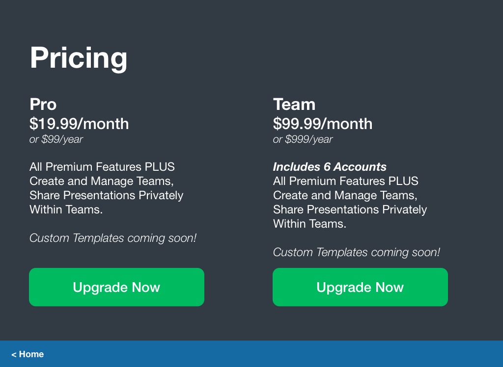 All Premium Features PLUS Create and Manage Teams, Share Presentations Privately Within Teams.