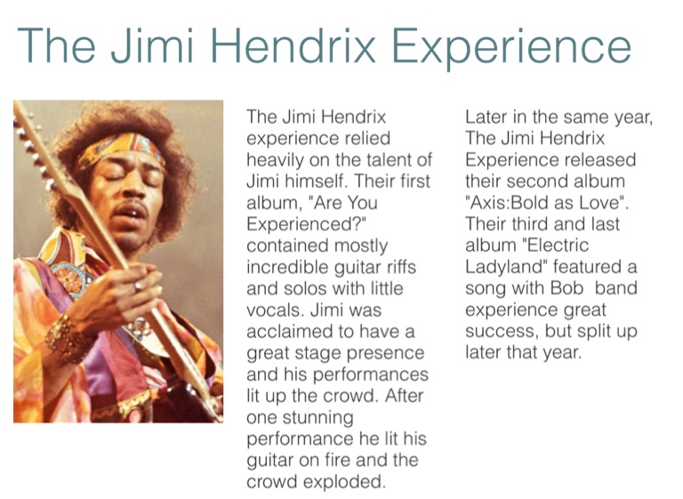 The Jimi Hendrix experience relied heavily on the talent of Jimi himself. Their first album, "Are You Experienced?" contained mostly incredible guitar riffs and solos with little vocals. Jimi was acclaimed to have a great stage presence and his performances lit up the crowd. After one stunning performance he lit his guitar on fire and the crowd exploded.