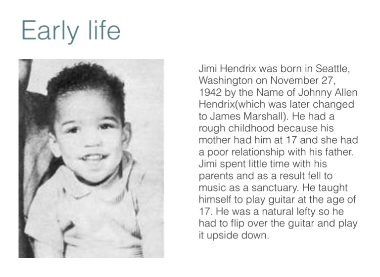 Jimi Hendrix was born in Seattle, Washington on November 27, 1942 by the Name of Johnny Allen Hendrix(which was later changed to James Marshall). He had a rough childhood because his mother had him at 17 and she had a poor relationship with his father. Jimi spent little time with his parents and as a result fell to music as a sanctuary. He taught himself to play guitar at the age of 17. He was a natural lefty so he had to flip over the guitar and play it upside down.