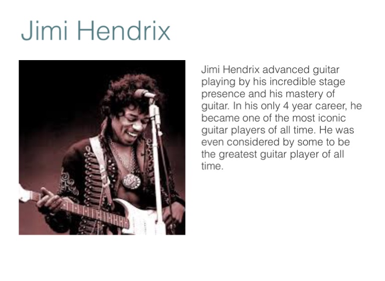 Jimi Hendrix advanced guitar playing by his incredible stage presence and his mastery of guitar. In his only 4 year career, he became one of the most iconic guitar players of all time. He was even considered by some to be the greatest guitar player of all time.