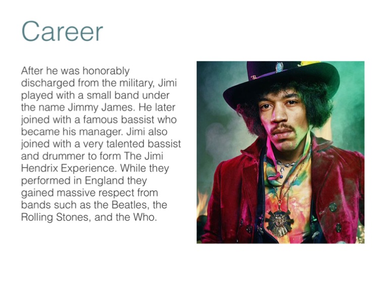 After he was honorably discharged from the military, Jimi played with a small band under the name Jimmy James. He later joined with a famous bassist who became his manager. Jimi also joined with a very talented bassist and drummer to form The Jimi Hendrix Experience. While they performed in England they gained massive respect from bands such as the Beatles, the Rolling Stones, and the Who.