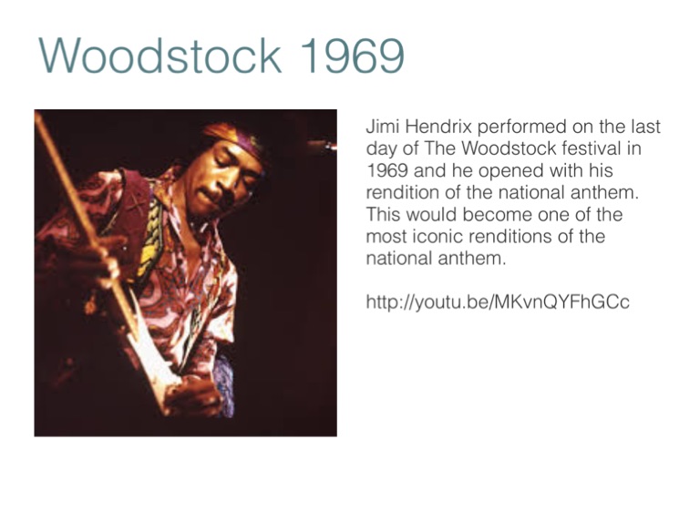 Jimi Hendrix performed on the last day of The Woodstock festival in 1969 and he opened with his rendition of the national anthem. This would become one of the most iconic renditions of the national anthem.