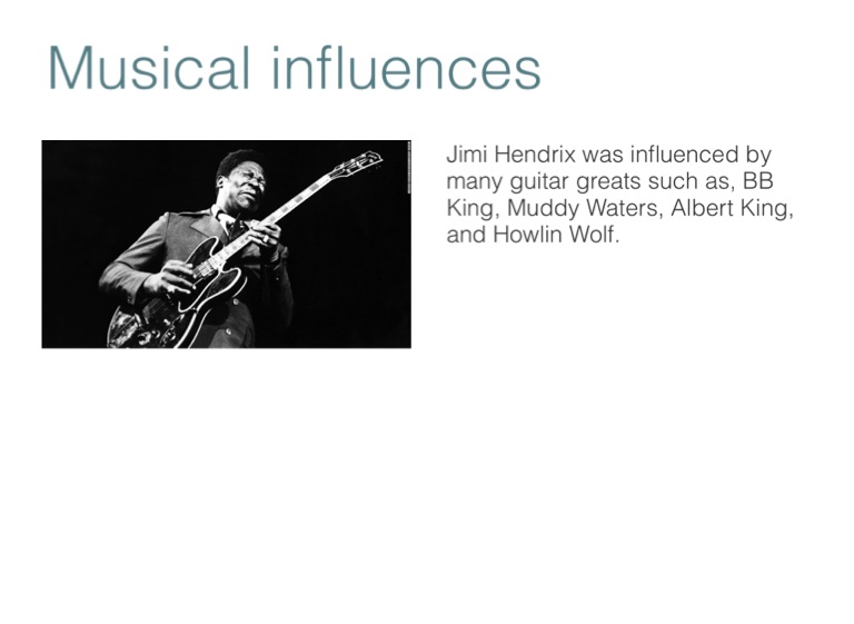 Jimi Hendrix was influenced by many guitar greats such as, BB King, Muddy Waters, Albert King, and Howlin Wolf.