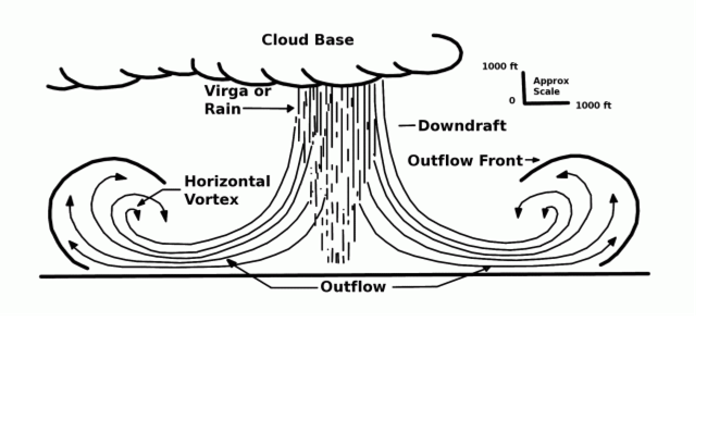 Cold air begins to descend from the middle and upper levels of a thunderstorm (falling at speeds of less than 20 miles an hour). As the colder air strikes the Earth's surface, it begins to "roll" - much like water as a boat moves through it. As the colder air "rolls" out, it is compressed causing winds to increase dramatically - at times even stronger than tornado winds!