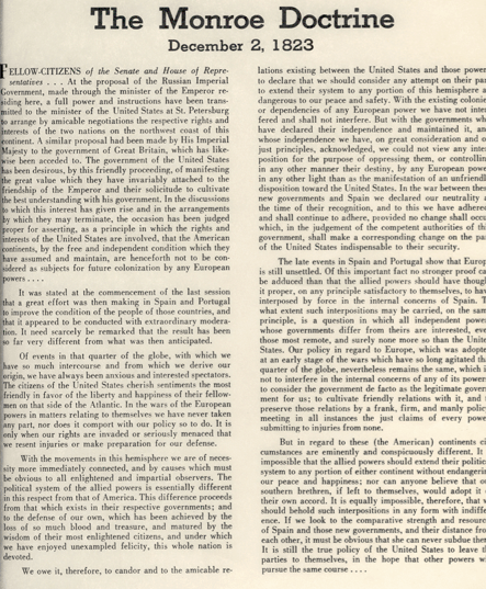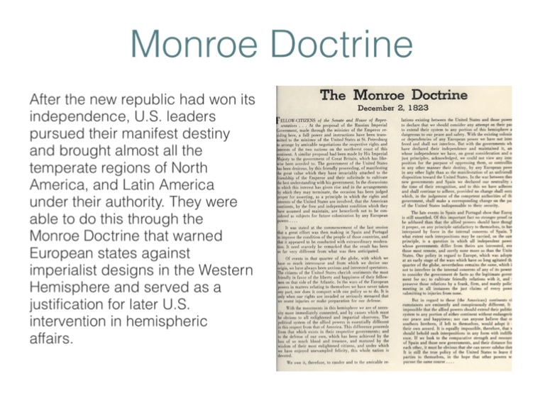 After the new republic had won its independence, U.S. leaders pursued their manifest destiny and brought almost all the temperate regions of North America, and Latin America under their authority. They were able to do this through the Monroe Doctrine that warned European states against imperialist designs in the Western Hemisphere and served as a justification for later U.S. intervention in hemispheric affairs.