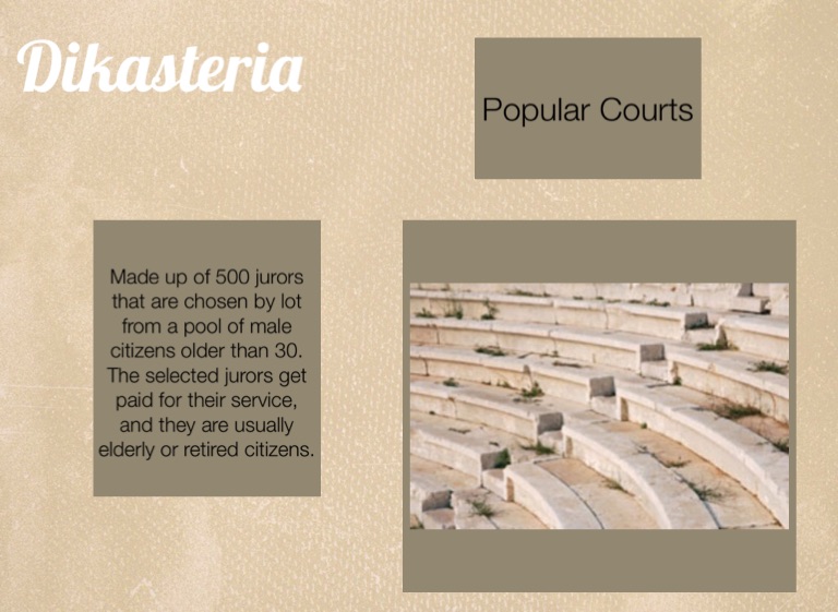Made up of 500 jurors that are chosen by lot from a pool of male citizens older than 30. The selected jurors get paid for their service, and they are usually elderly or retired citizens.