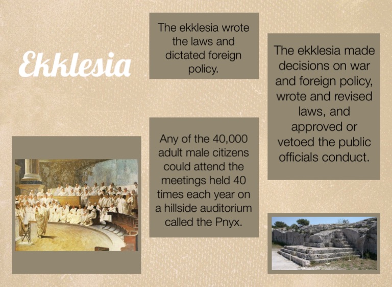 The ekklesia made decisions on war and foreign policy, wrote and revised laws, and approved or vetoed the public officials conduct.