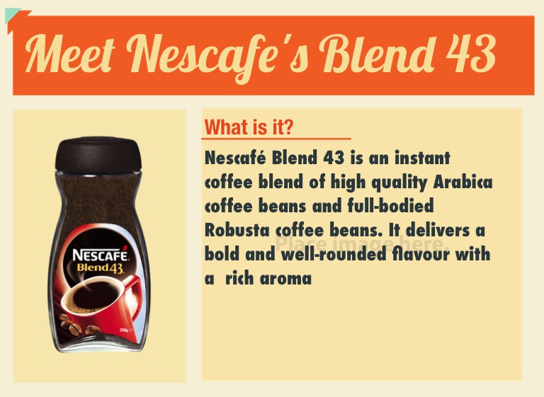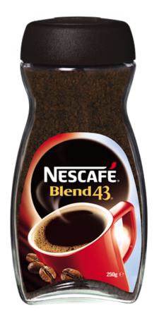 Nescafé Blend 43 is an instant coffee blend of high quality Arabica coffee beans and full-bodied Robusta coffee beans. It delivers a bold and well-rounded flavour with a rich aroma