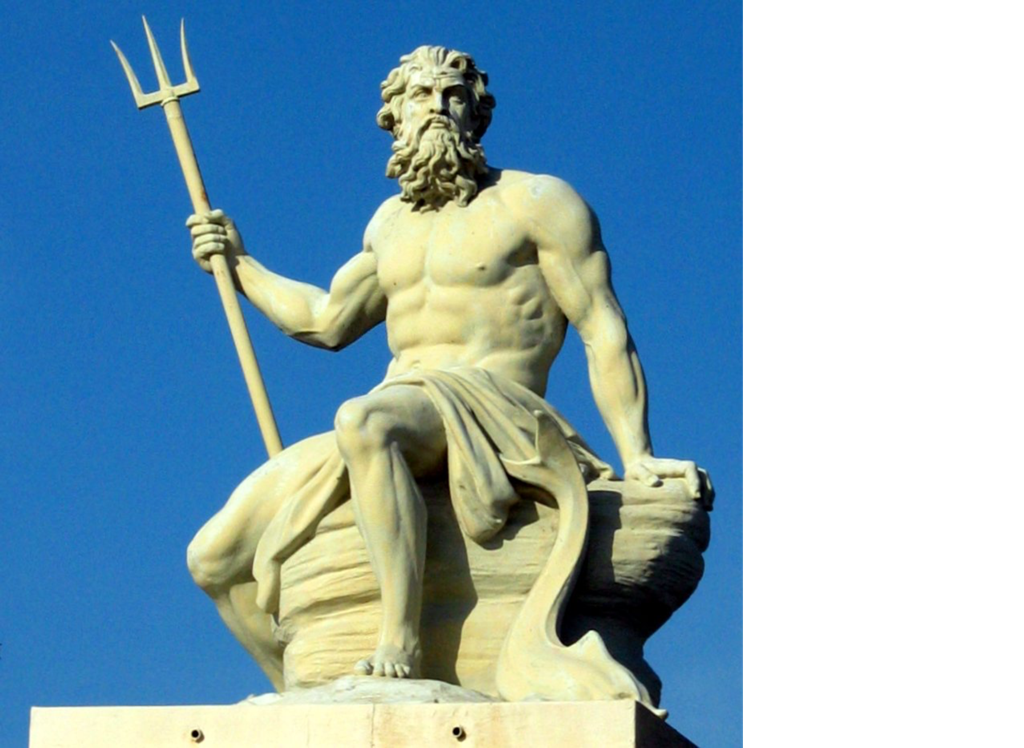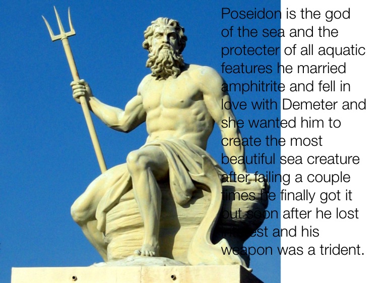 Poseidon is the god of the sea and the protecter of all aquatic features he married amphitrite and fell in love with Demeter and she wanted him to create the most beautiful sea creature after failing a couple times he finally got it but soon after he lost interest and his weapon was a trident.