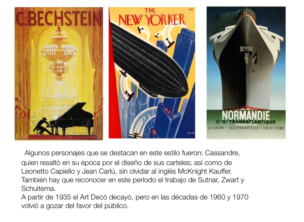 Algunos personajes que se destacan en este estilo fueron: Cassandre, quien resaltó en su época por el diseño de sus carteles; así como de Leonetto Capiello y Jean Carlú, sin olvidar al inglés McKnight Kauffer. También hay que reconocer en este período el trabajo de Sutnar, Zwart y Schuitema.