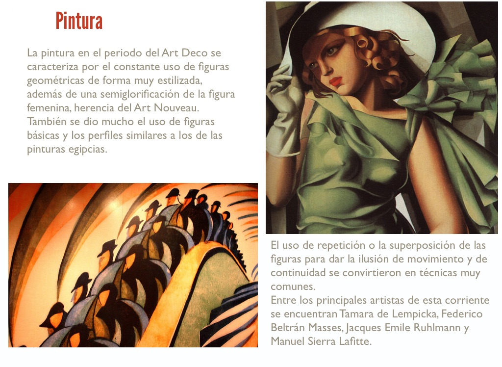 La pintura en el periodo del Art Deco se caracteriza por el constante uso de figuras geométricas de forma muy estilizada, además de una semiglorificación de la figura femenina, herencia del Art Nouveau.
