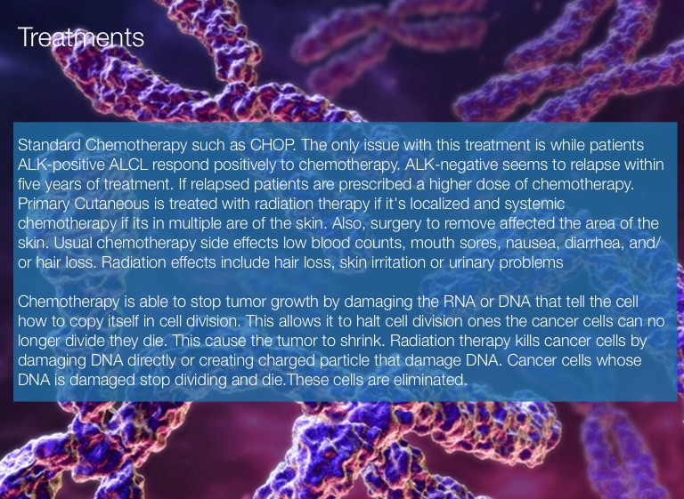Standard Chemotherapy such as CHOP. The only issue with this treatment is while patients ALK-positive ALCL respond positively to chemotherapy. ALK-negative seems to relapse within five years of treatment. If relapsed patients are prescribed a higher dose of chemotherapy. Primary Cutaneous is treated with radiation therapy if it's localized and systemic chemotherapy if its in multiple are of the skin. Also, surgery to remove affected the area of the skin. Usual chemotherapy side effects low blood counts, mouth sores, nausea, diarrhea, and/or hair loss. Radiation effects include hair loss, skin irritation or urinary problems