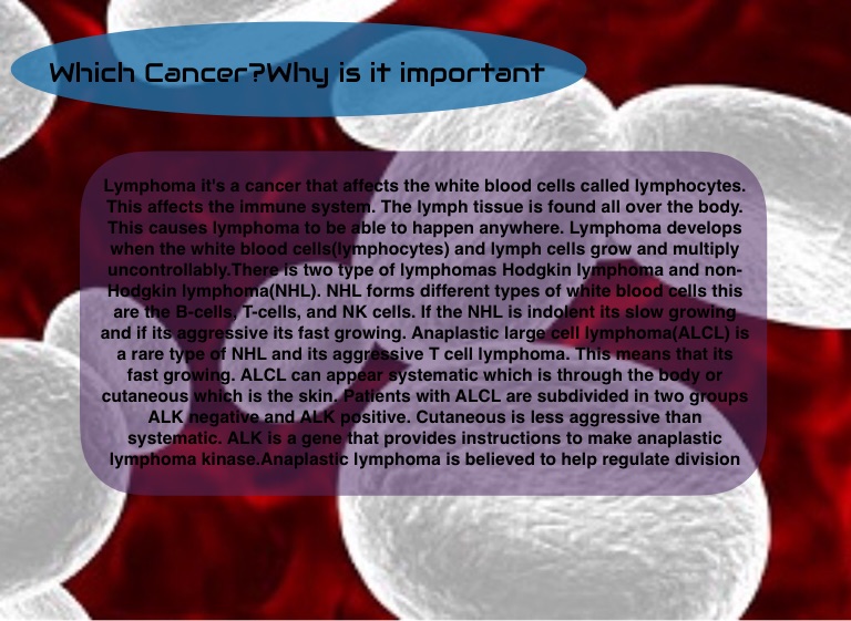Lymphoma it's a cancer that affects the white blood cells called lymphocytes. This affects the immune system. The lymph tissue is found all over the body. This causes lymphoma to be able to happen anywhere. Lymphoma develops when the white blood cells(lymphocytes) and lymph cells grow and multiply uncontrollably.There is two type of lymphomas Hodgkin lymphoma and non-Hodgkin lymphoma(NHL). NHL forms different types of white blood cells this are the B-cells, T-cells, and NK cells. If the NHL is indolent its slow growing and if its aggressive its fast growing. Anaplastic large cell lymphoma(ALCL) is a rare type of NHL and its aggressive T cell lymphoma. This means that its fast growing. ALCL can appear systematic which is through the body or cutaneous which is the skin. Patients with ALCL are subdivided in two groups ALK negative and ALK positive. Cutaneous is less aggressive than systematic. ALK is a gene that provides instructions to make anaplastic lymphoma kinase.Anaplastic lymphoma is believed to help regulate division of nerve cells.