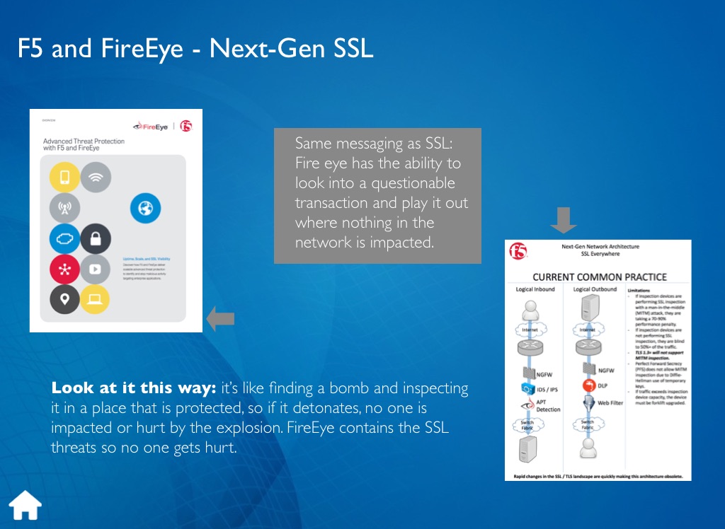 Look at it this way: it’s like finding a bomb and inspecting it in a place that is protected, so if it detonates, no one is impacted or hurt by the explosion. FireEye contains the SSL threats so no one gets hurt.