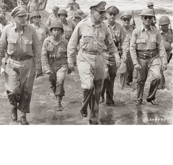 MacArthur was famous in WWI for walking in front of his troops into battle and continued to through WWII (shown left).