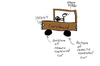 My project is using the third newtons law to operate in the races. I'm gonna use small, but durable cardboard boxes, and I have to have them to light weight. I'm gonna use a sharpie to make the person inside my car and the steering wheel. I'm gonna use the bottom of a race car for extra friction and cover ground more quickly on the opposition. I'm gonna use the remote controlled car tires to power my car. Lastly, in case, of I hit a road block, I'm gonna use a soft, but durable material such as something like straws as a bumper.