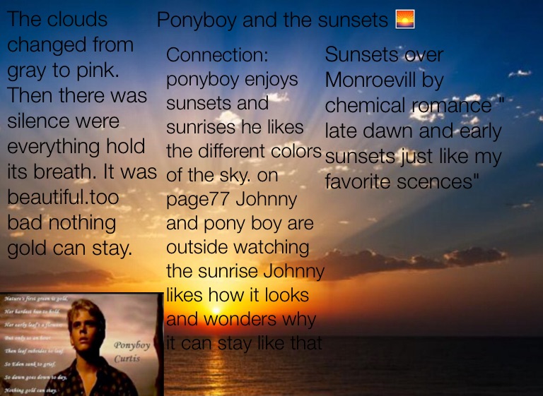 Connection: ponyboy enjoys sunsets and sunrises he likes the different colors of the sky. on page77 Johnny and pony boy are outside watching the sunrise Johnny likes how it looks and wonders why it can stay like that